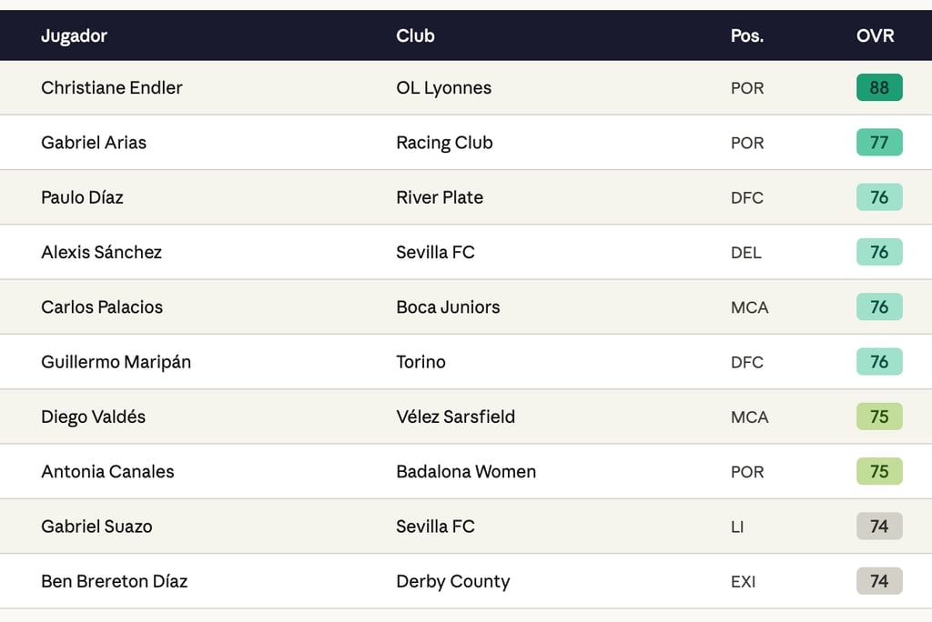 Los ratings oficiales de los jugadores chilenos en EA Sports FC 26, según la base de datos oficial de EA Sports. La selección chilena está encabezada por Christiane Endler, la mejor portera del mundo, seguida por Gabriel Arias y Paulo Díaz.